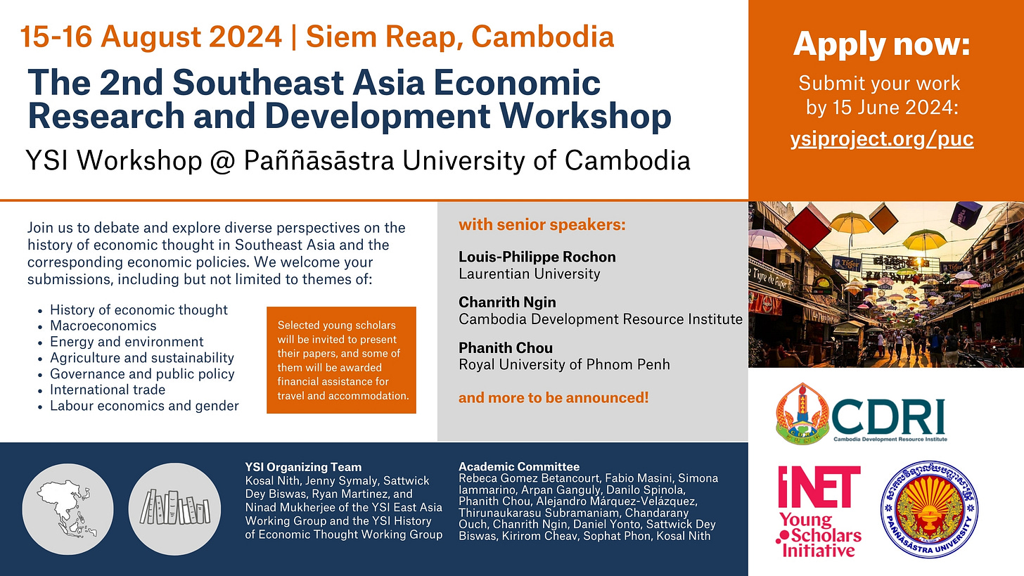 With this background in mind, we, on behalf of the Young Scholars Initiative (YSI), the Cambodia Development Resource Institute (CDRI), and Paññāsāstra University of Cambodia (PUC), extend a warm invitation to PhD scholars and early career researchers for a two-day workshop on economic research and development in Southeast Asia. We welcome submissions focusing on various aspects of the region’s economic landscape, including but not limited to the following areas: