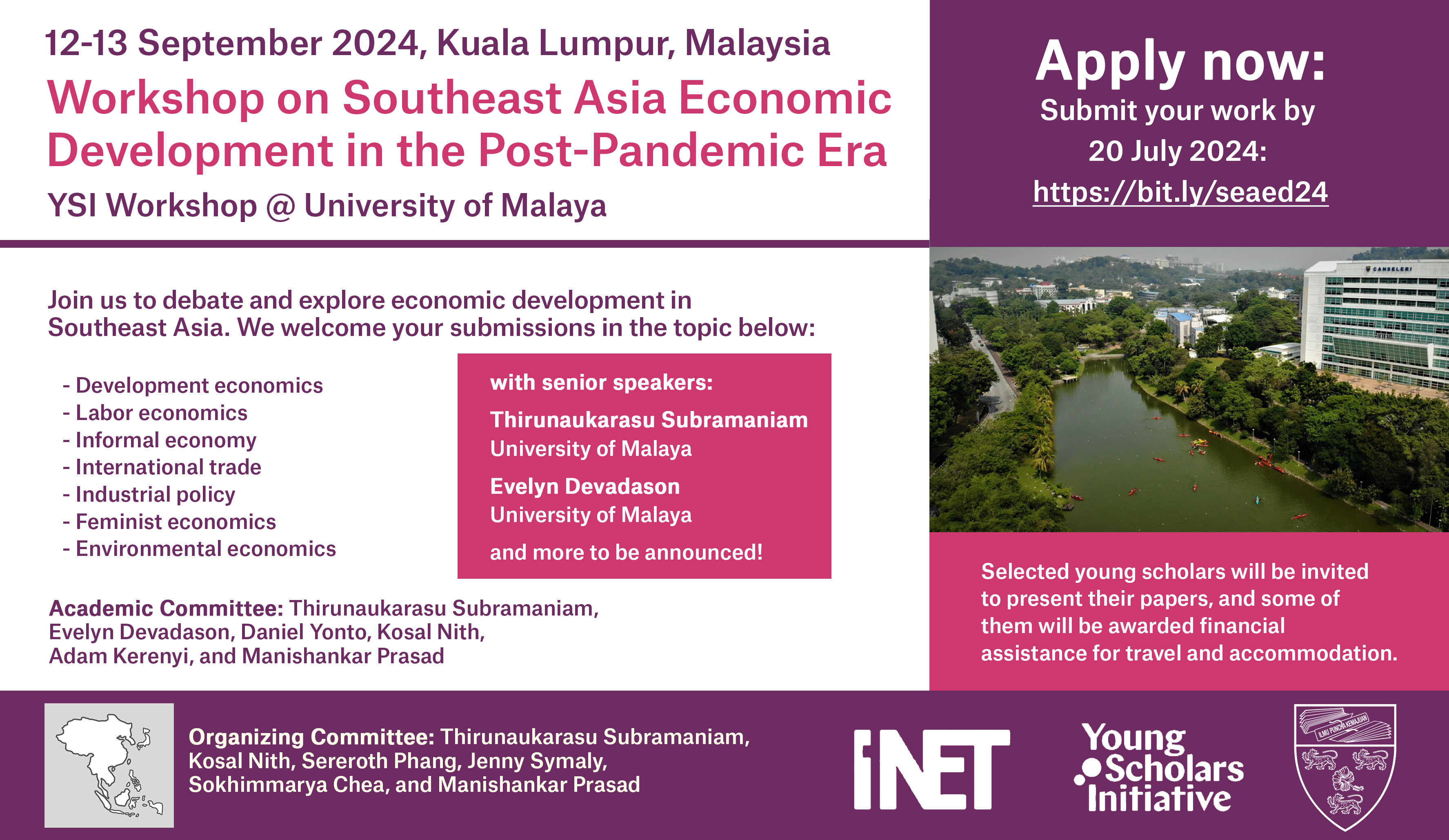 Aligned with these concerns, which aim to comprehensively assess the region's development after COVID-19 and devise innovative solutions for recovery and resilience, the Young Scholars Initiative (YSI) and the University of Malaya invite PhD students and young scholars to present their work on related topics. By presenting their work, these emerging academics can contribute to dissecting regional growth in the post-pandemic era, identifying vulnerabilities, and uncovering opportunities for economic development. Submissions are welcome on various aspects of the region's economic landscape, spanning the following areas: