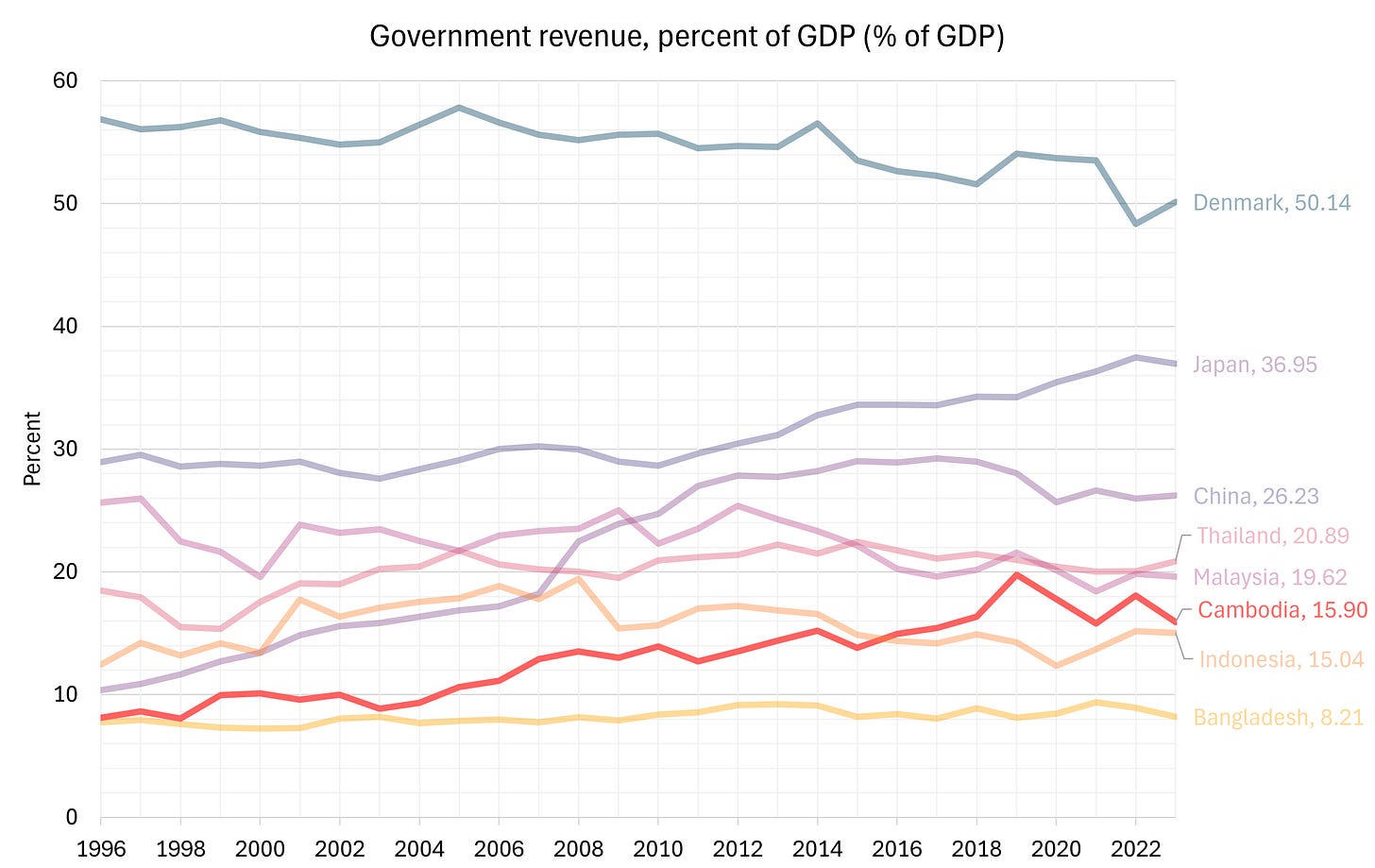Money comes from taxes. In 2024, the General Department of Taxation (GDT) collected revenue equal to about 14.57% of its GDP. While the government aims to increase tax revenue, the current tax structure remains narrow and heavily reliant on indirect taxes, particularly value-added tax (VAT), import duties, and corporate income tax. There is still room for Cambodia to increase tax collection.